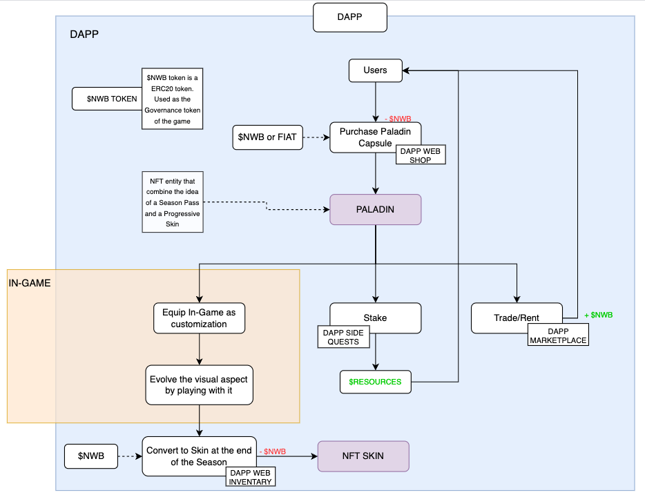The figure below describes the entire lifecycle of a Paladin from the Dapp, where it can be purchased via capsules, traded or staked, to the game where they can be played and evolved.
